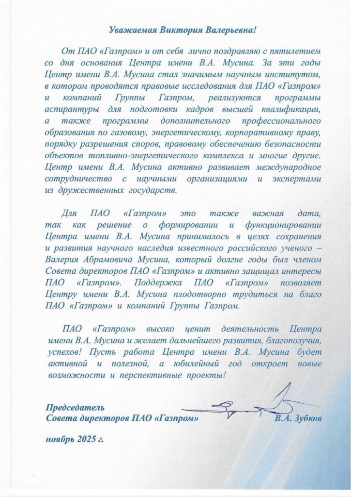Центр имени В.А.Мусина сердечно благодарит ПАО «Газпром» и лично Председателя Совета Директоров Виктора Алексеевича Зубкова за поддержку, помощь, памятное отношение и теплое поздравление в связи с пятилетием Центра имени В.А.Мусина. Для нас огромная честь работать на благо ПАО «Газпром» и компаний Группы Газпром. Низкий поклон за возможность развивать научное наследие Валерия Абрамовича Мусина.