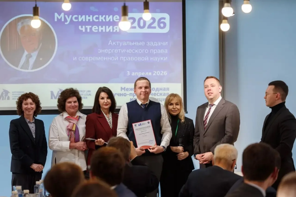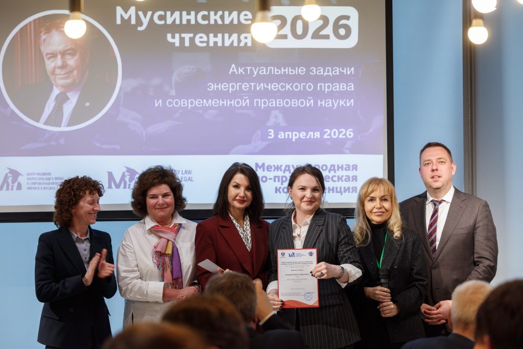 Состоялось торжественное награждение участников I этапа Всероссийского конкурса научных публикаций молодых специалистов ТЭК и молодых ученых, награждение участников конкурса 2026 года. В торжественной церемонии награждения приняли участие: директор Центра имени В.А.Мусина , д.ю.н., профессор Виктория Валерьевна Романова, заместитель начальника Управления Министерства юстиции Российской Федерации по Москве Елена Валентиновна Сущенко, директор Департамента энергетики Евразийской экономической комиссии Ольга Филипповна Прудникова, заместитель генерального директора ПАО «ЭЛ5 Энерго», д.ю.н. Жанна Игоревна Седова, директор Департамента нормативно-правового обеспечения ПАО «Интер РАО», к.ю.н., Никита Александрович Жабин.