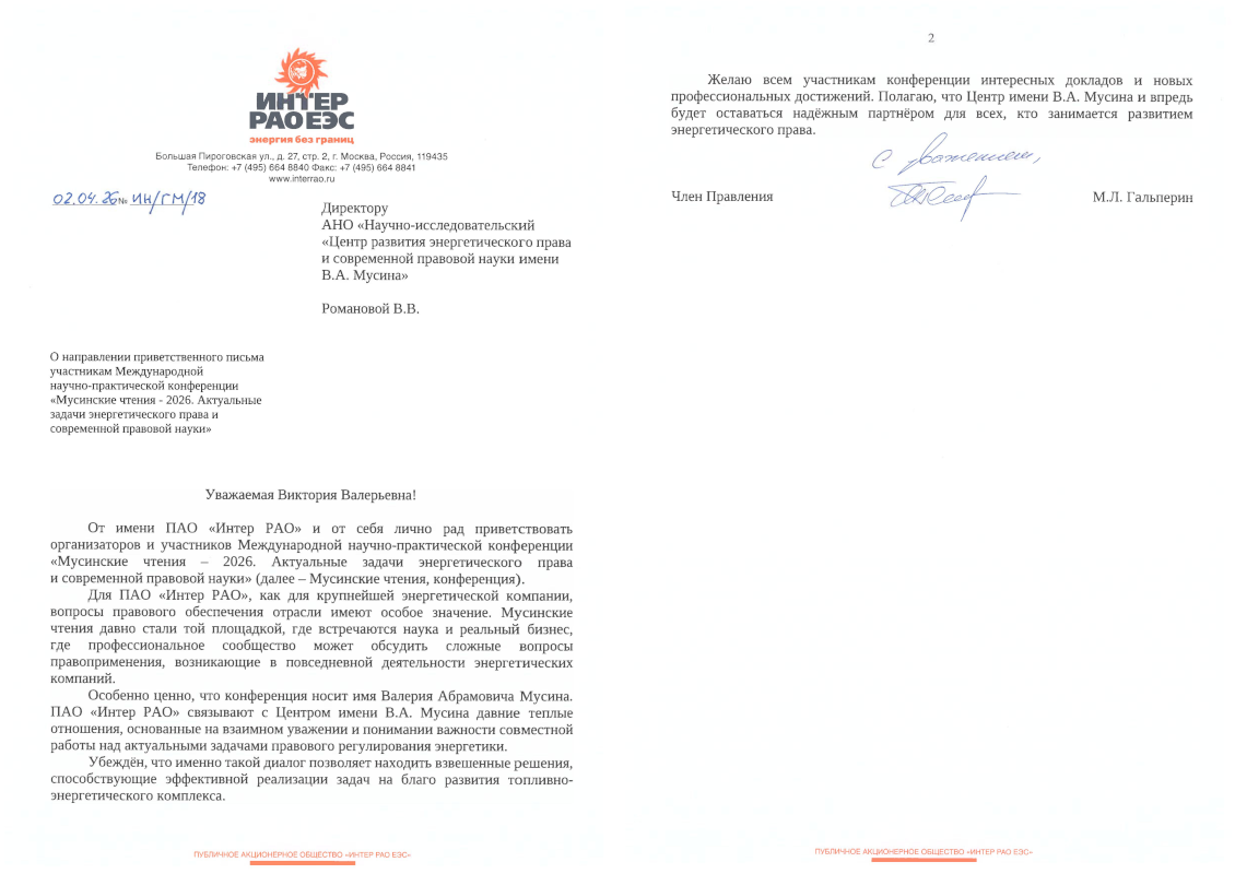 от Члена Правления ПАО «Интер РАО», д.ю.н. Михаила Львовича Гальперина;