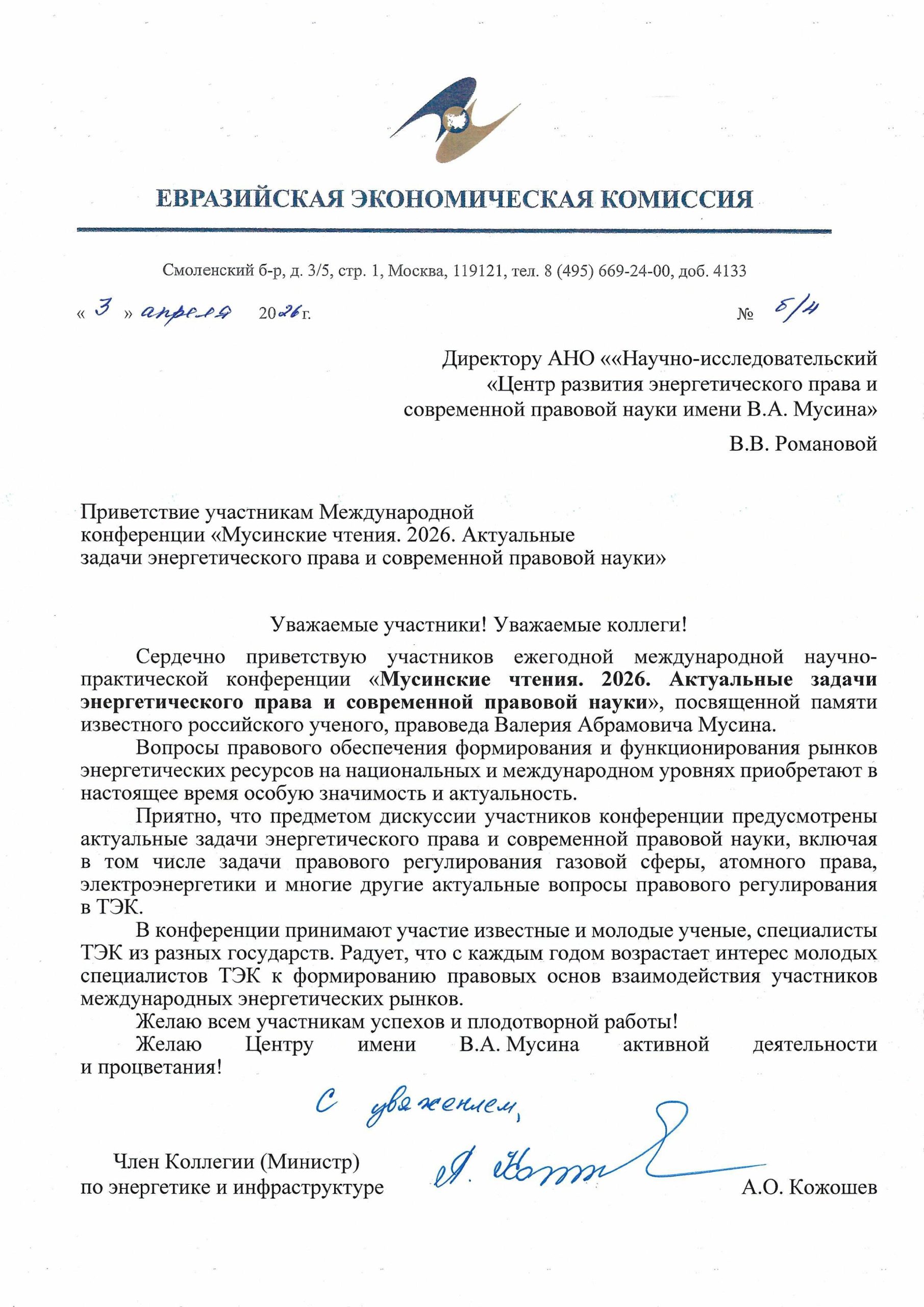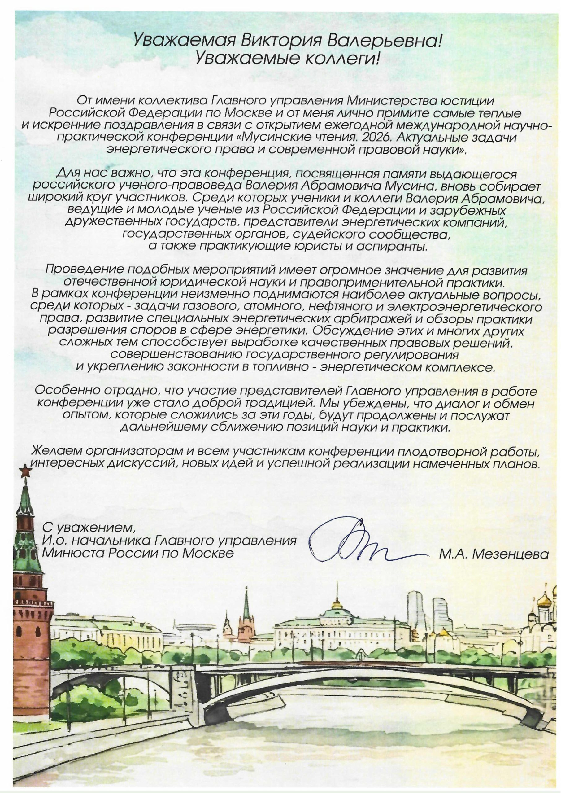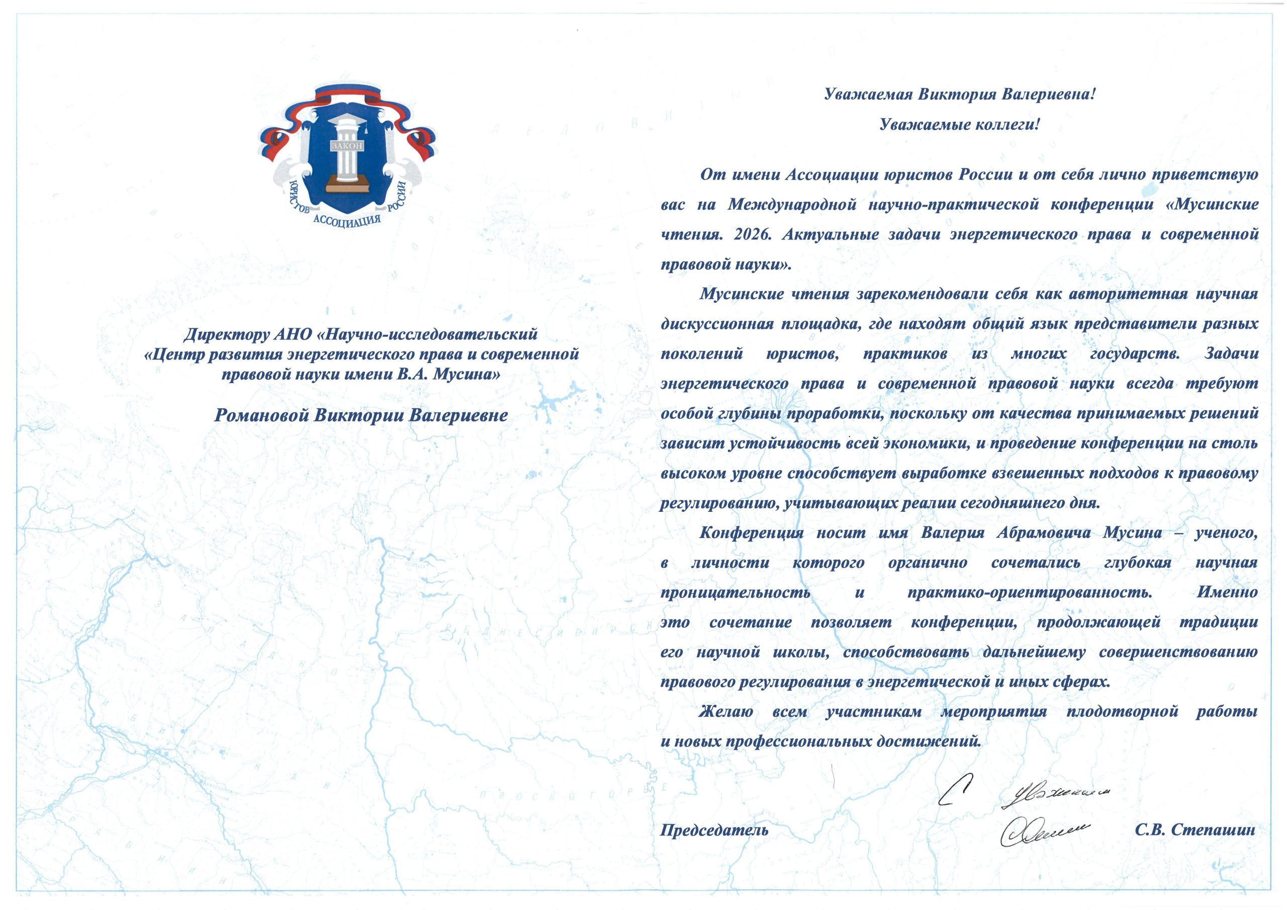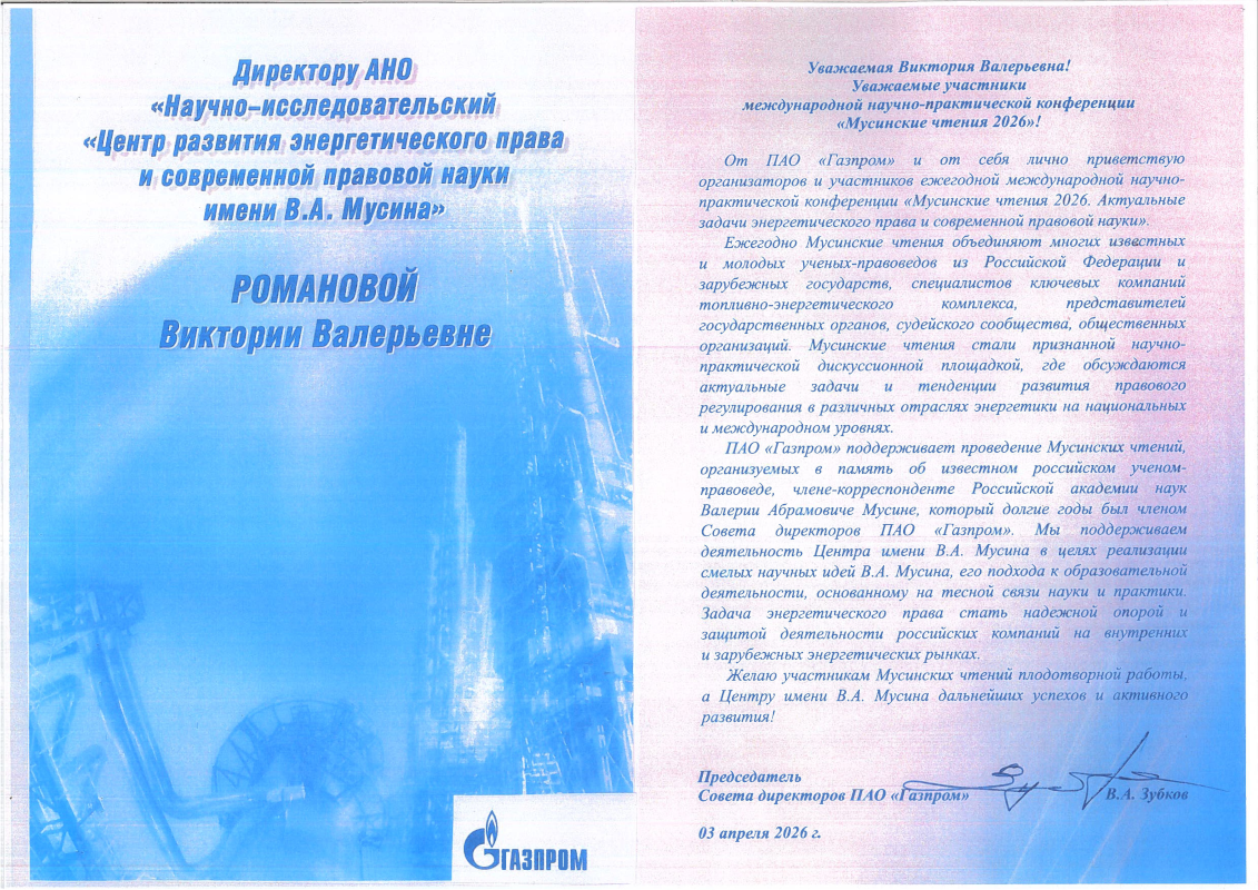 3 апреля 2026 года успешно состоялась Международная научно-практическая конференция «Мусинские чтения. 2026. Актуальные задачи энергетического права и современной правовой науки». Организаторы: АНО «Научно-исследовательский «Центр развития энергетического права и современной правовой науки имени В.А.Мусина» и Международный союз юристов. Модератор конференции – Романова Виктория Валерьевна, д.ю.н., профессор, директор АНО «Научно-исследовательский «Центр развития энергетического права и современной правовой науки имени В.А.Мусина», председатель Комиссии Ассоциации юристов России по энергетическому праву и развитию законодательства в сфере топливно-энергетического комплекса.