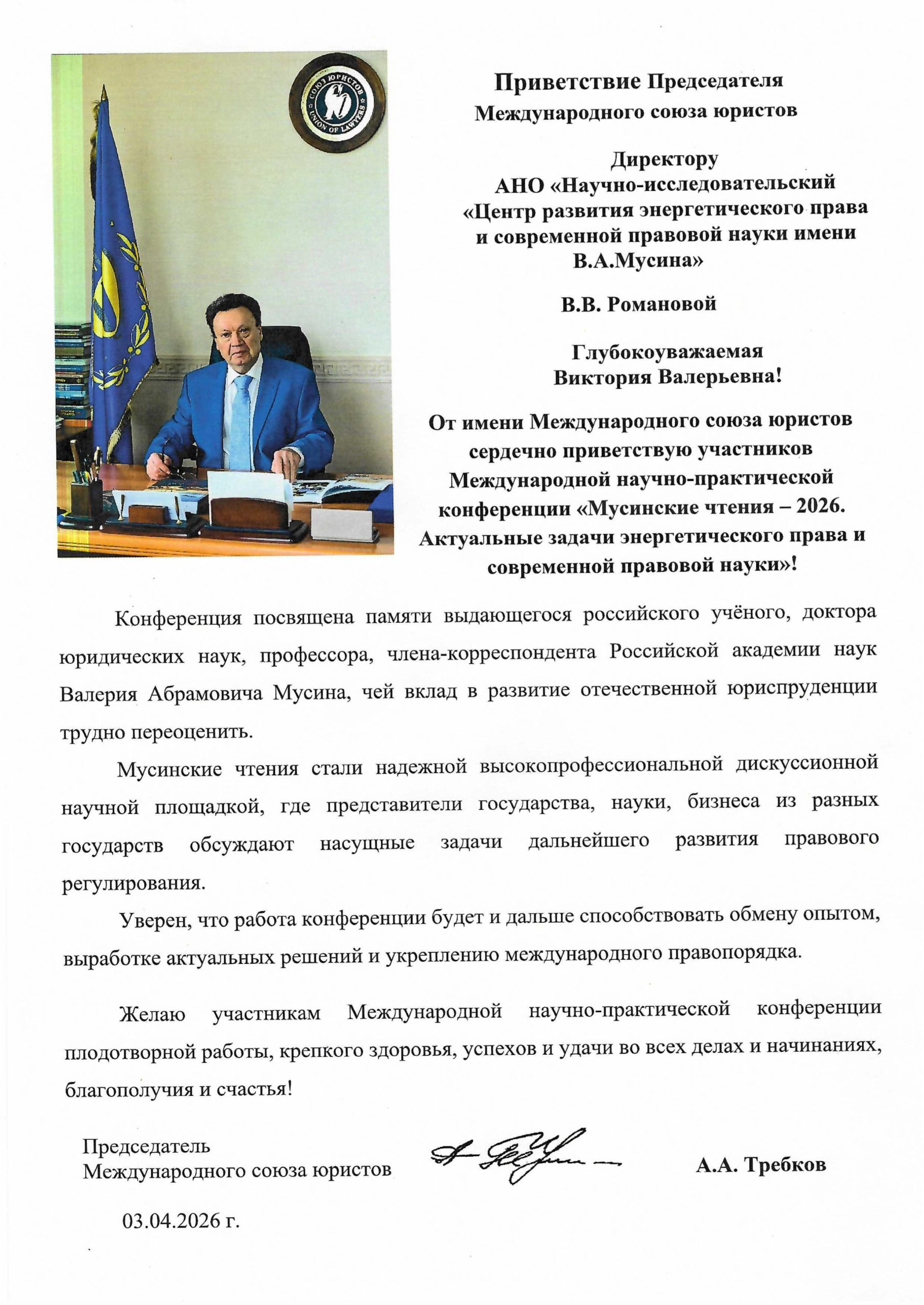 от Председателя Международного союза юристов Андрея Адамовича Требкова;
