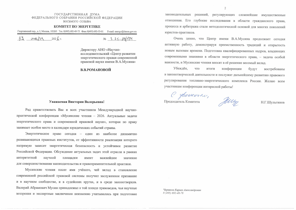 от Председателя Комитета Государственной Думы по энергетике Николая Григорьевича Шульгинова;