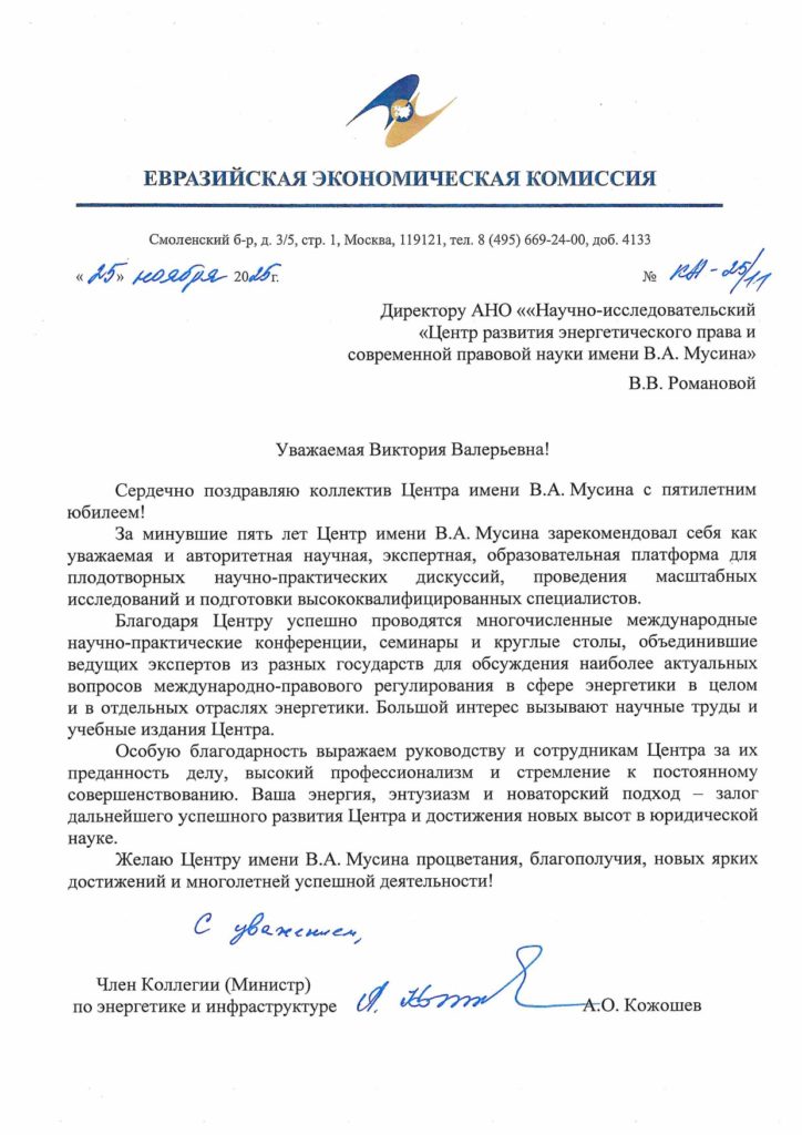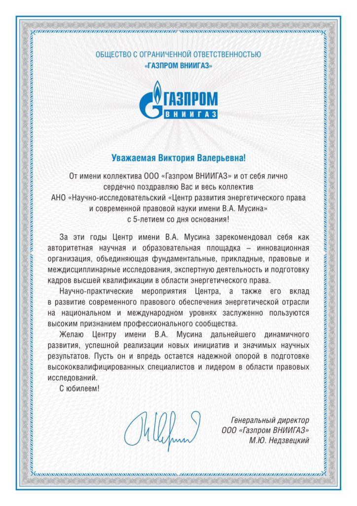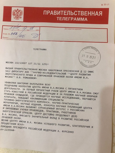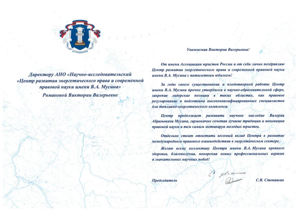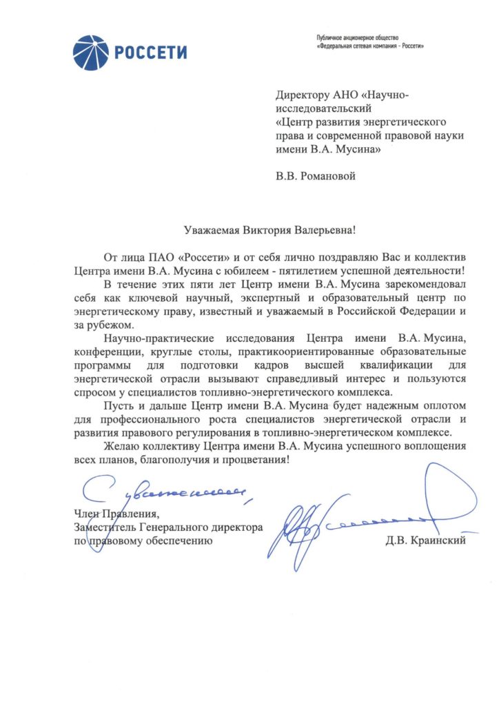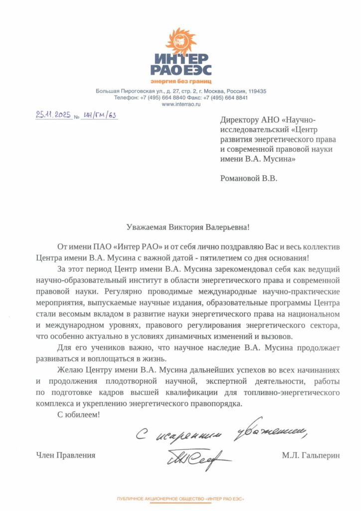 В 2025 году АНО «Научно-исследовательский «Центр развития энергетического права и современной правовой науки имени В.А.Мусина» отмечает 5 летние со дня основания Центра. В адрес Центра имени В.А.Мусина продолжают поступать теплые поздравления. Искренне благодарим всех за доброе отношение, поддержку и помощь! Будем размещать поздравления на нашем сайте, в телеграмм канале и нашем канале в МАХ.